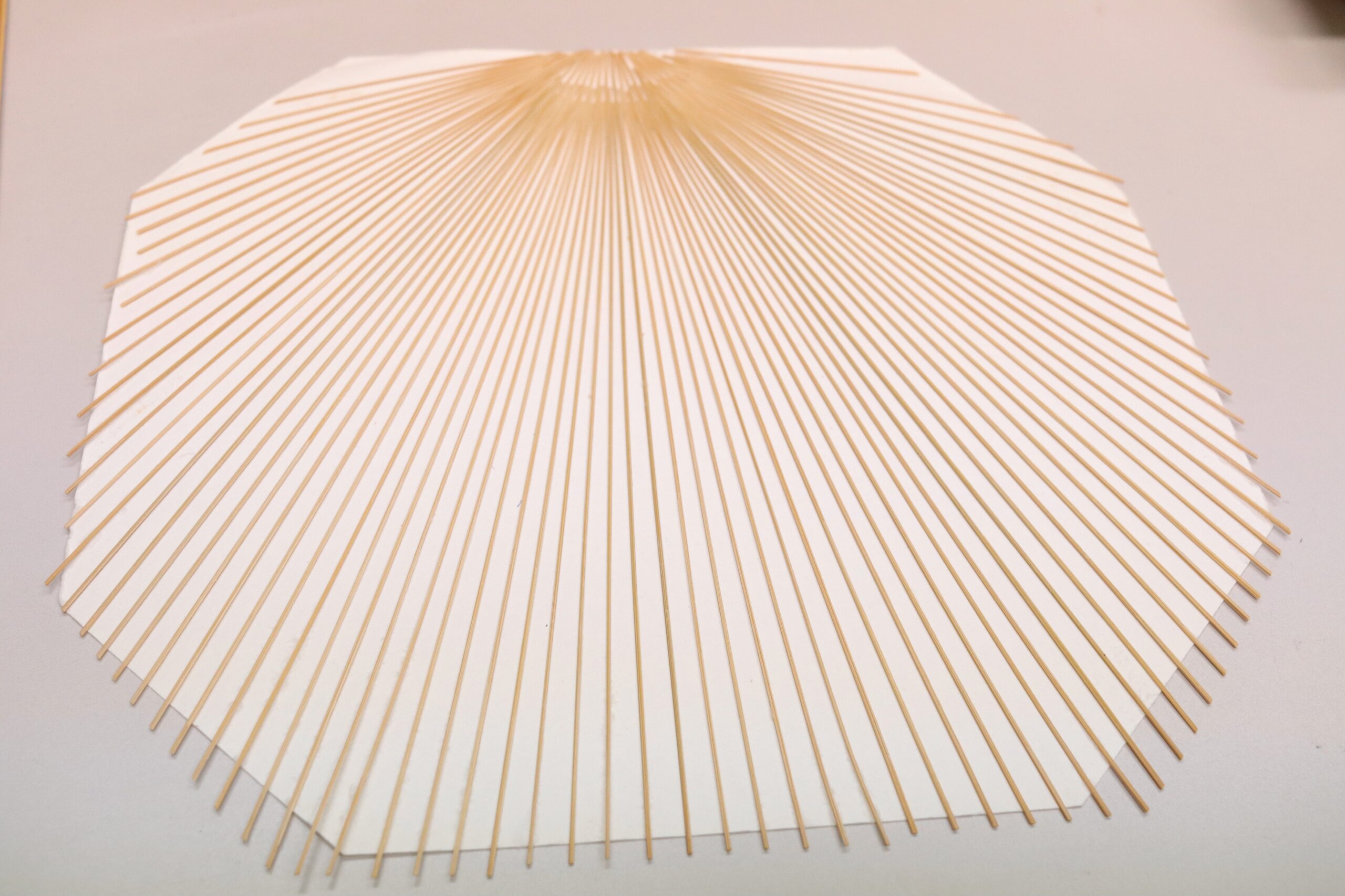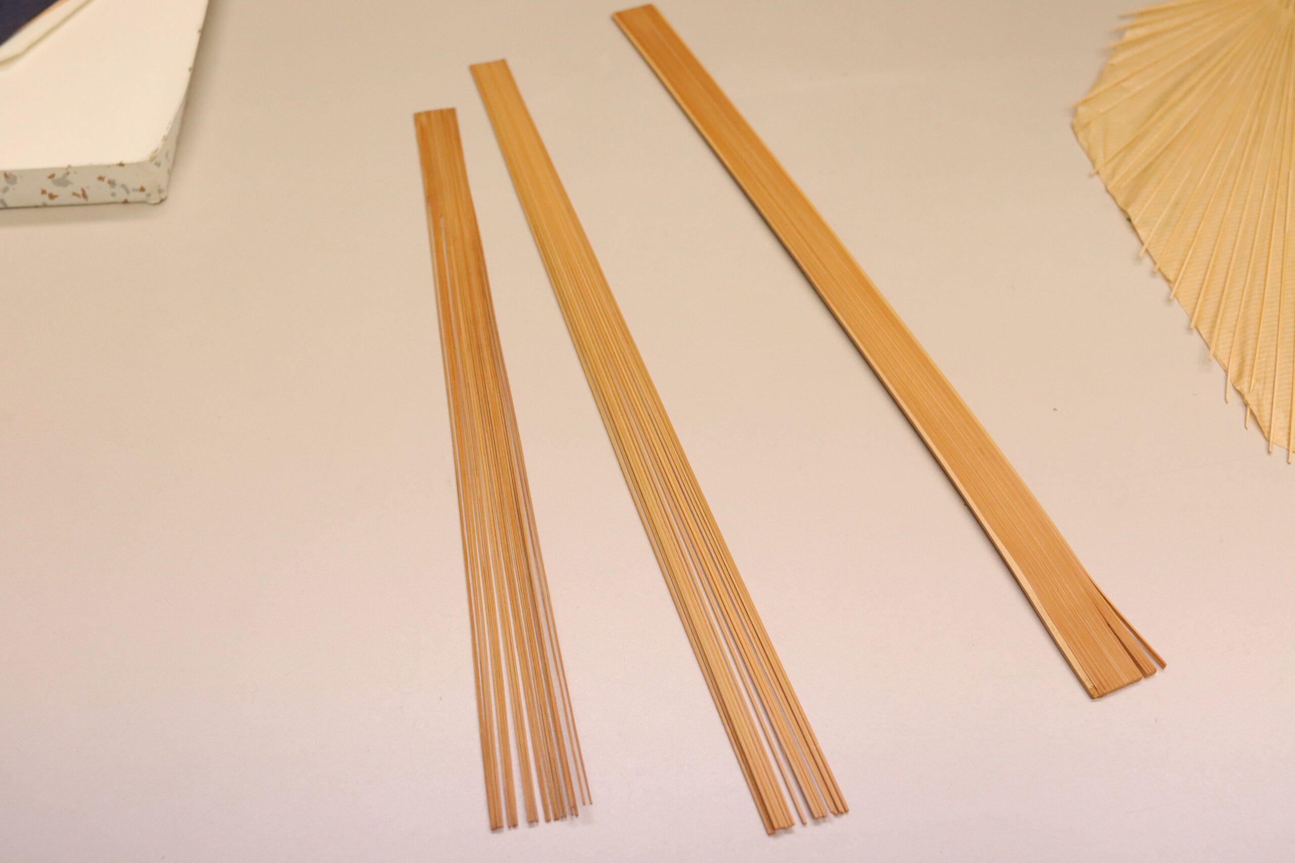 The shop clerk told me the process of making a Kyoto fun. First and foremost, qualified bamboo frames are essential in making a high-quality Kyoto fan. The bamboo is slit into smaller strips, and the strips are placed radially.