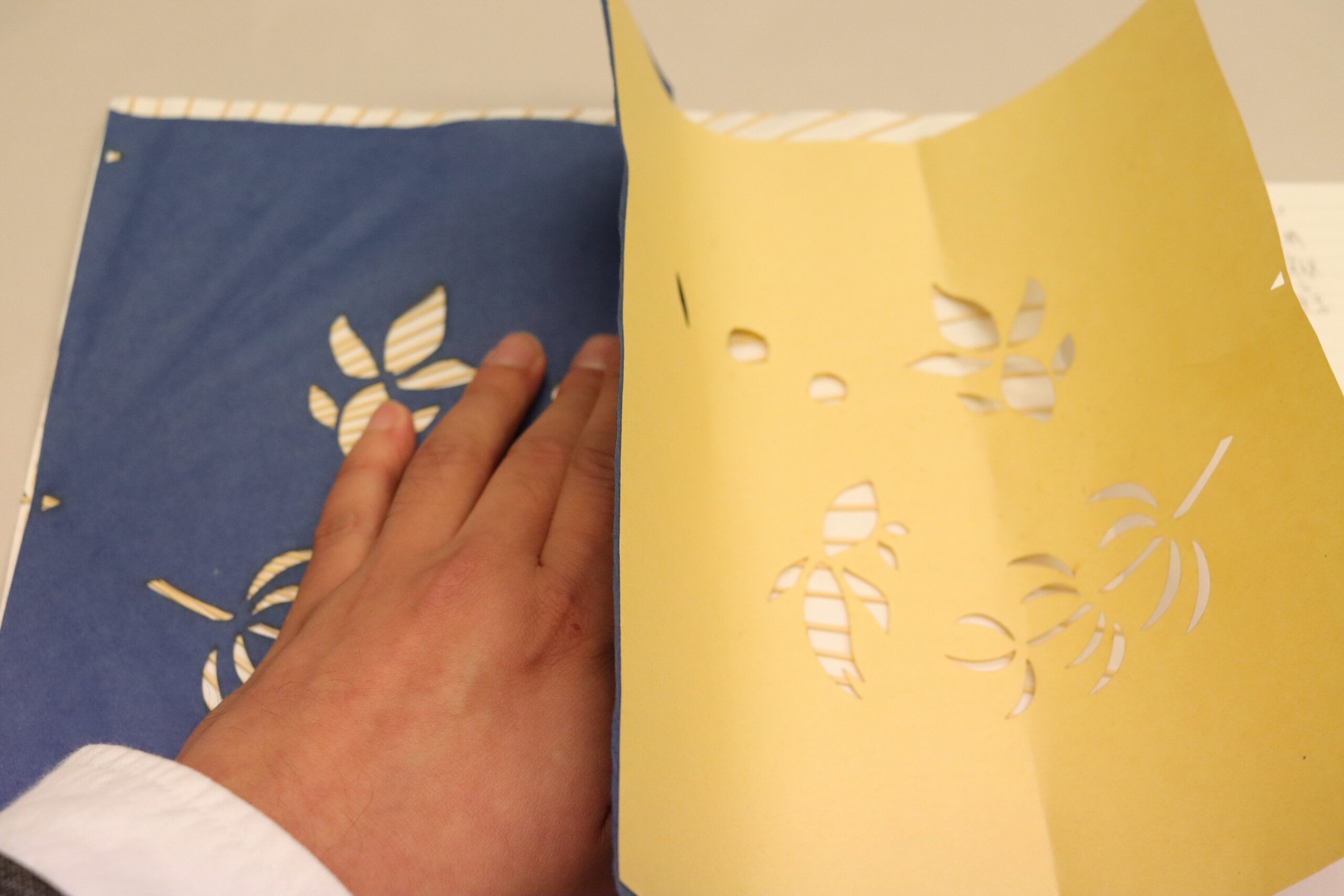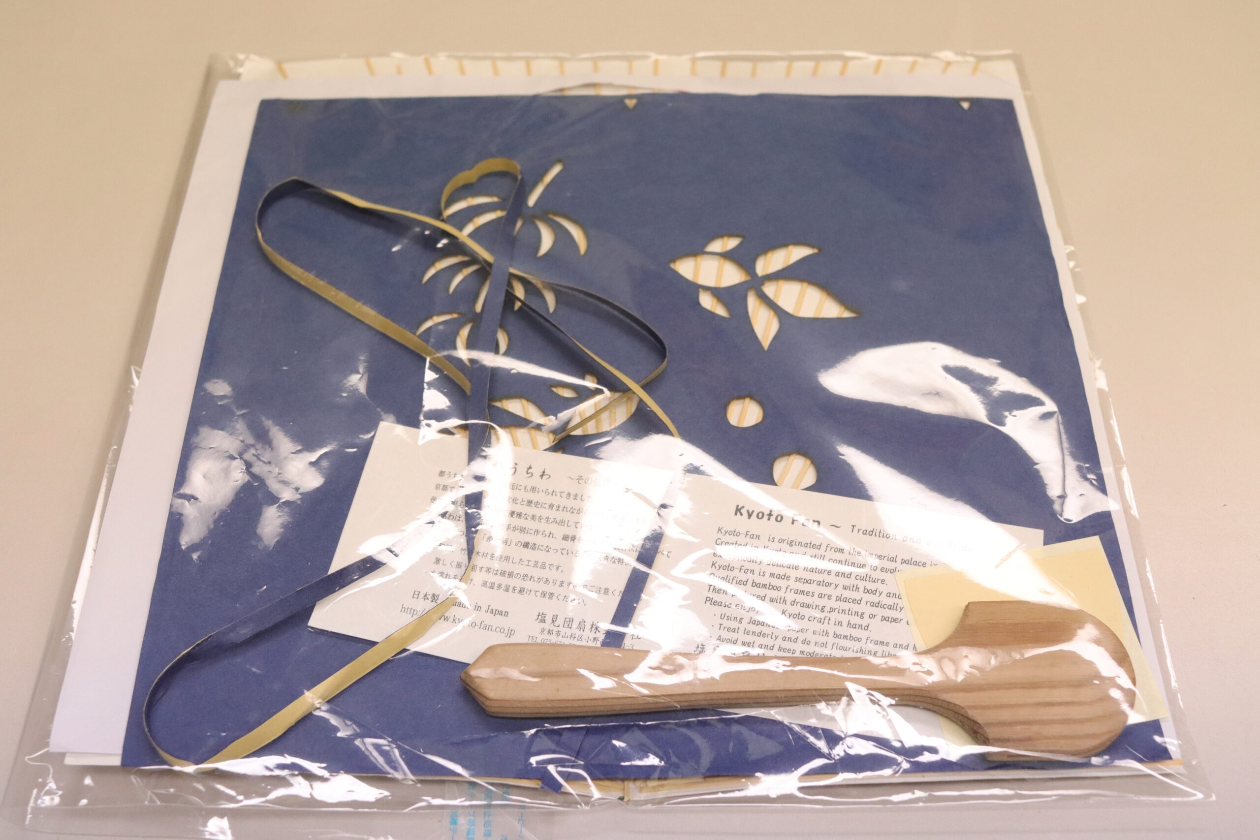 Now, a set for making a Kyoto- fan is prepared on the table. You can choose the color and the motif. This time, I chose blue paper with a motif of gold fish.