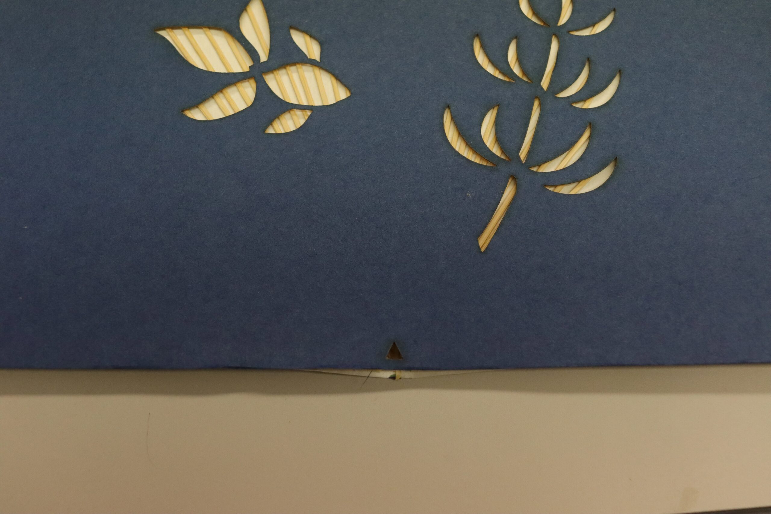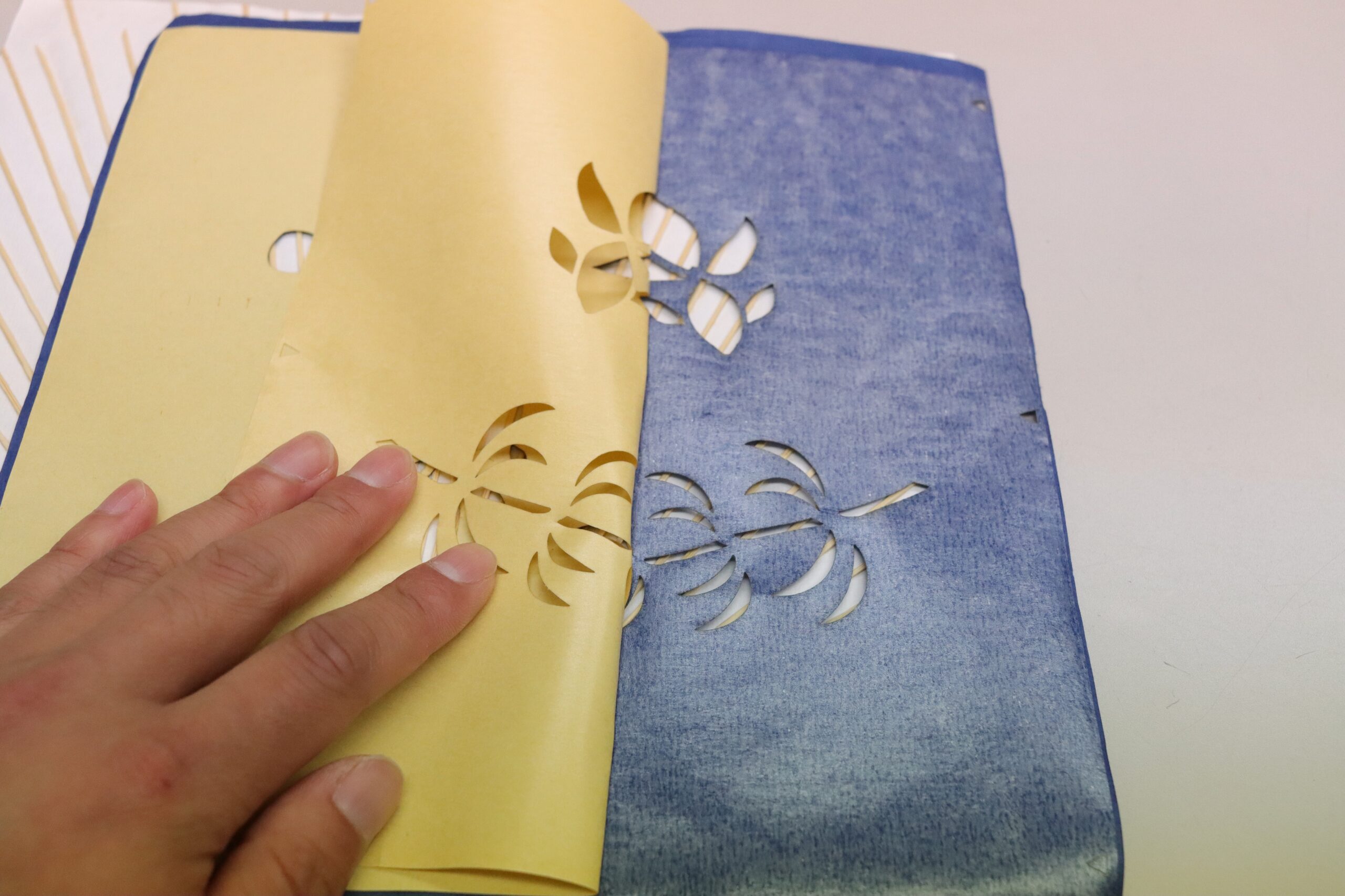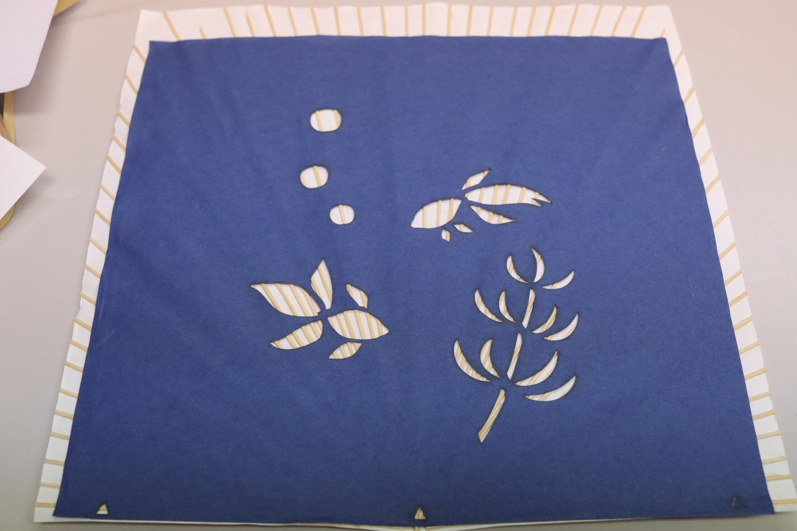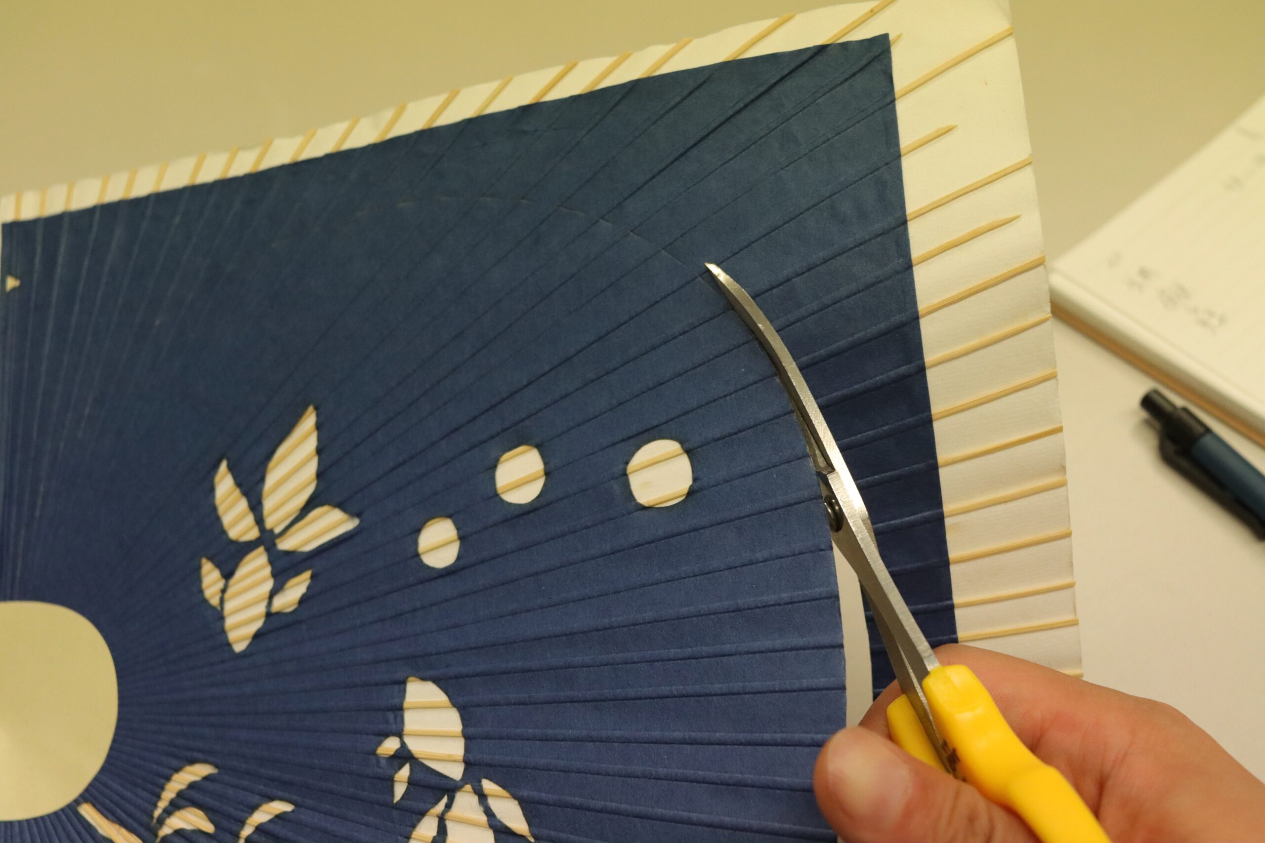 Then, I cut the paper pasted onto the bamboo frames with scissors, tracing the mark. The bamboo frames were a bit stiff to cut.