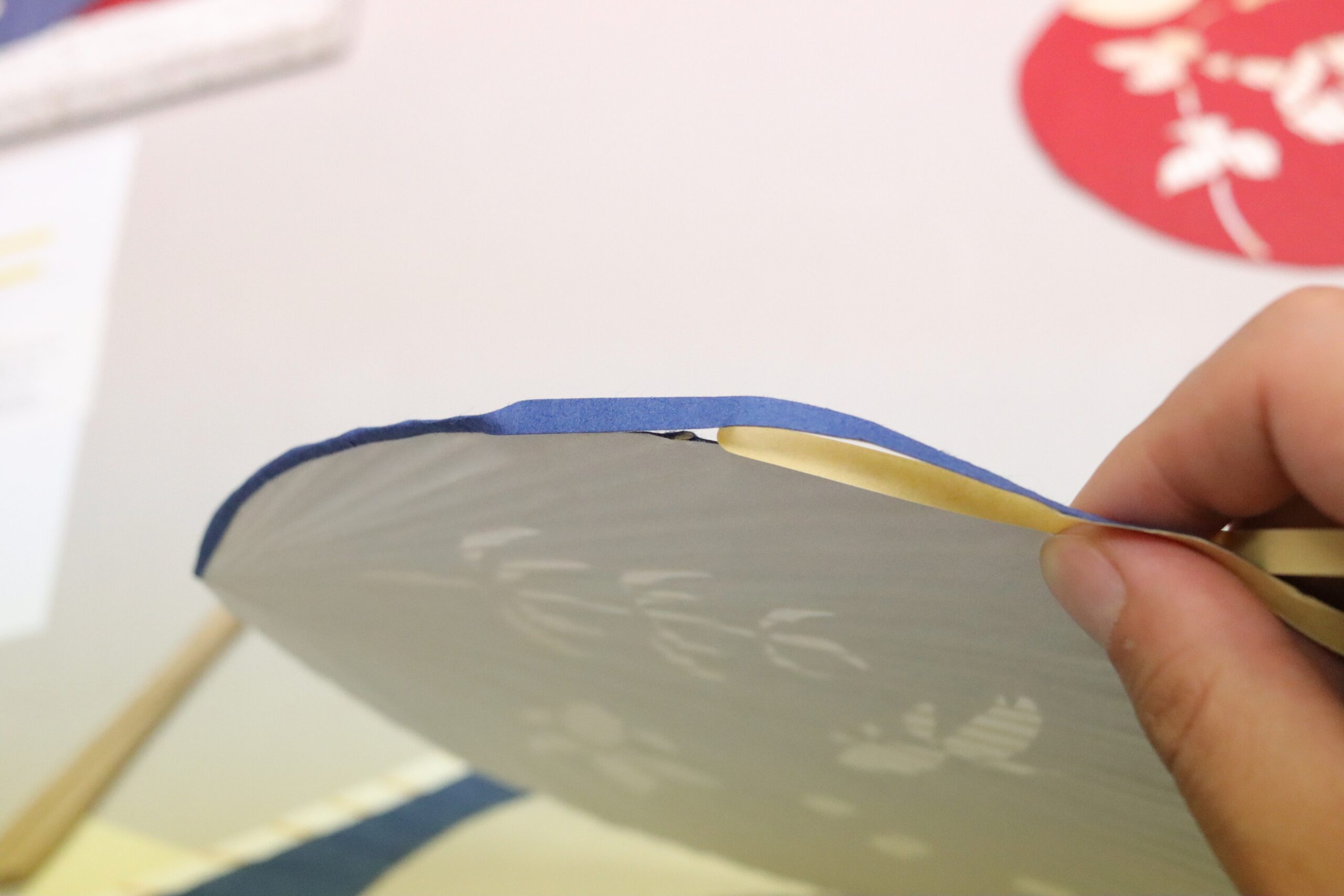 Next, I attached the grip to the paper fan, using glue.