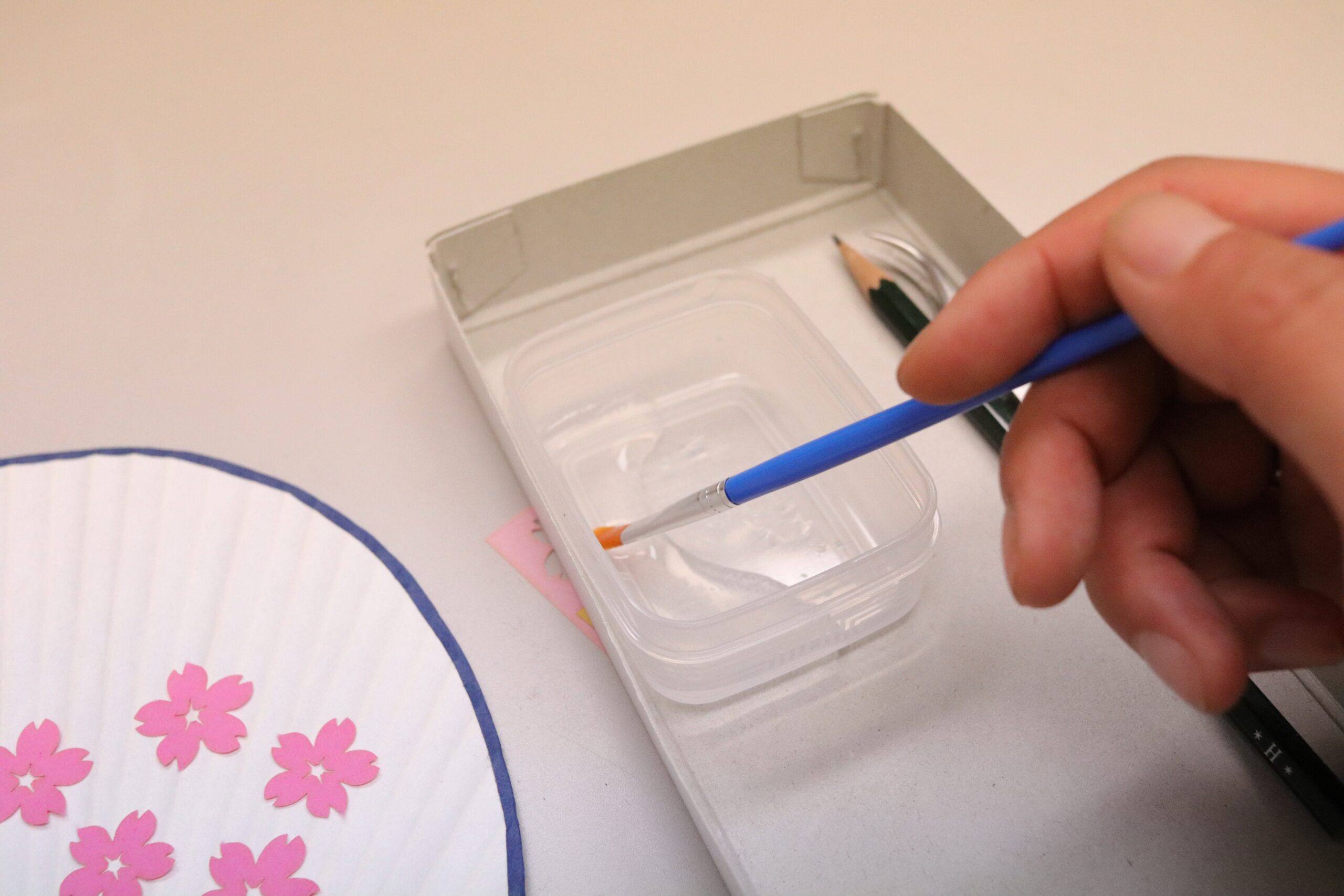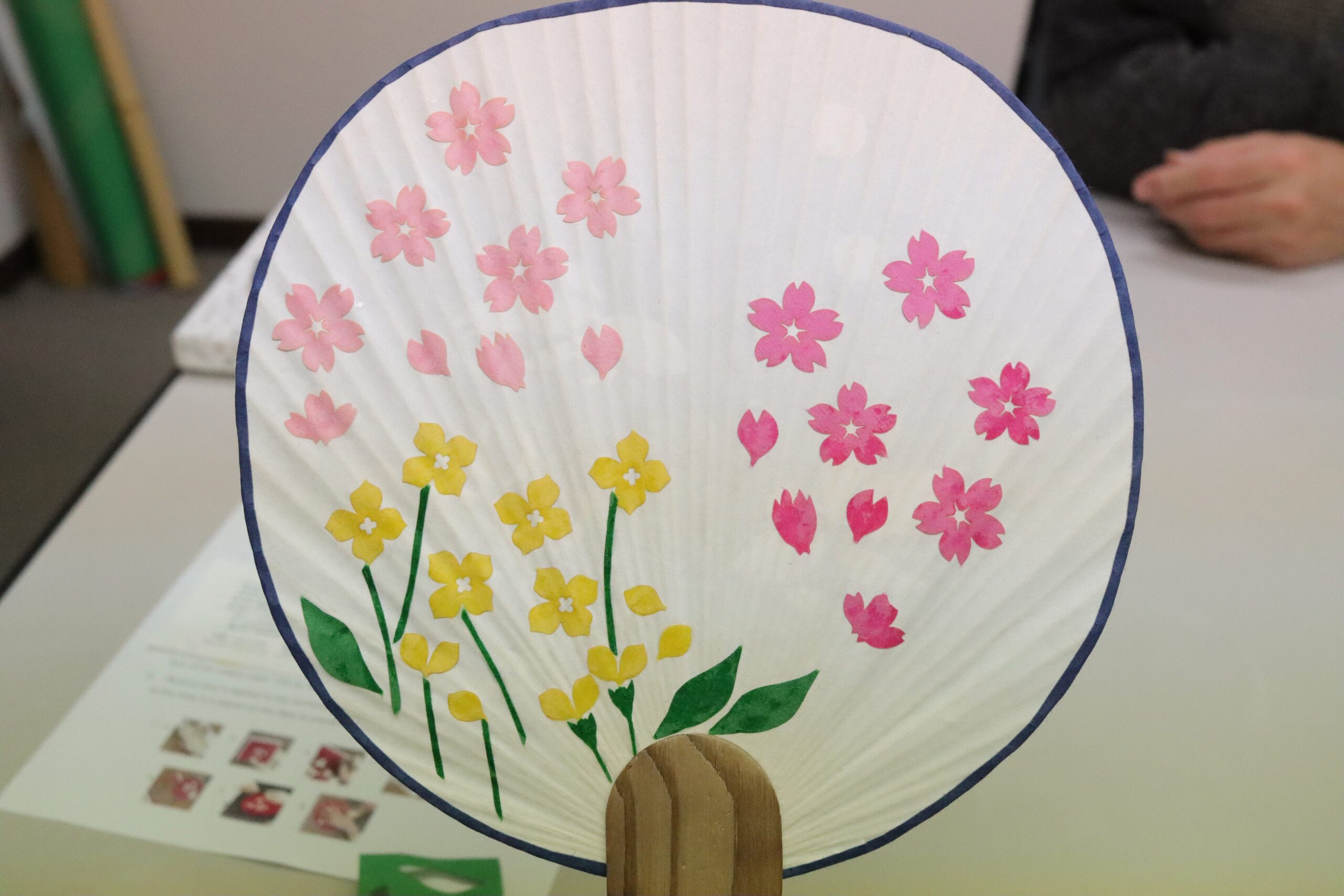 Finally, I put the finishing touches on it. I pasted paper motifs like cherry blossom petals on the other side of the paper fan. First, I needed to think about the layout of the motifs by just putting them on the paper fan, and decided on the design layout. Then, pasted them with glue, using a paintbrush.