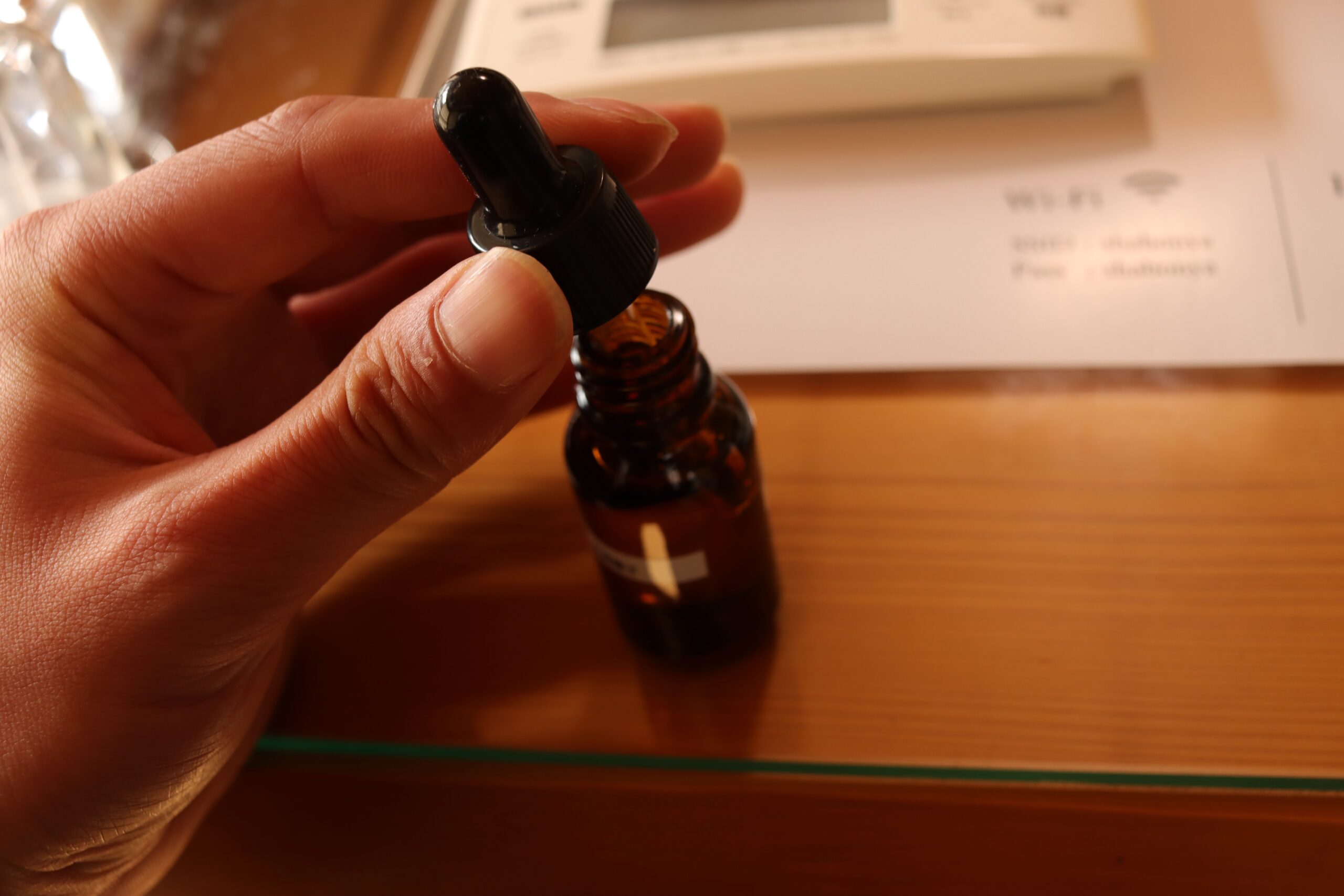Put the glass cup on a scale, and add oil. This time, I wanted to accentuate the fragrance of cypress, so I added three drops of cypress oil. As I noticed, adding an optimal balance of essential oils holds the key to success. For instance, adding too much ylang-ylang that gives off a strong fragrance would work as a nuisance and cancel out the natural fragrance that other Essential Oils have.