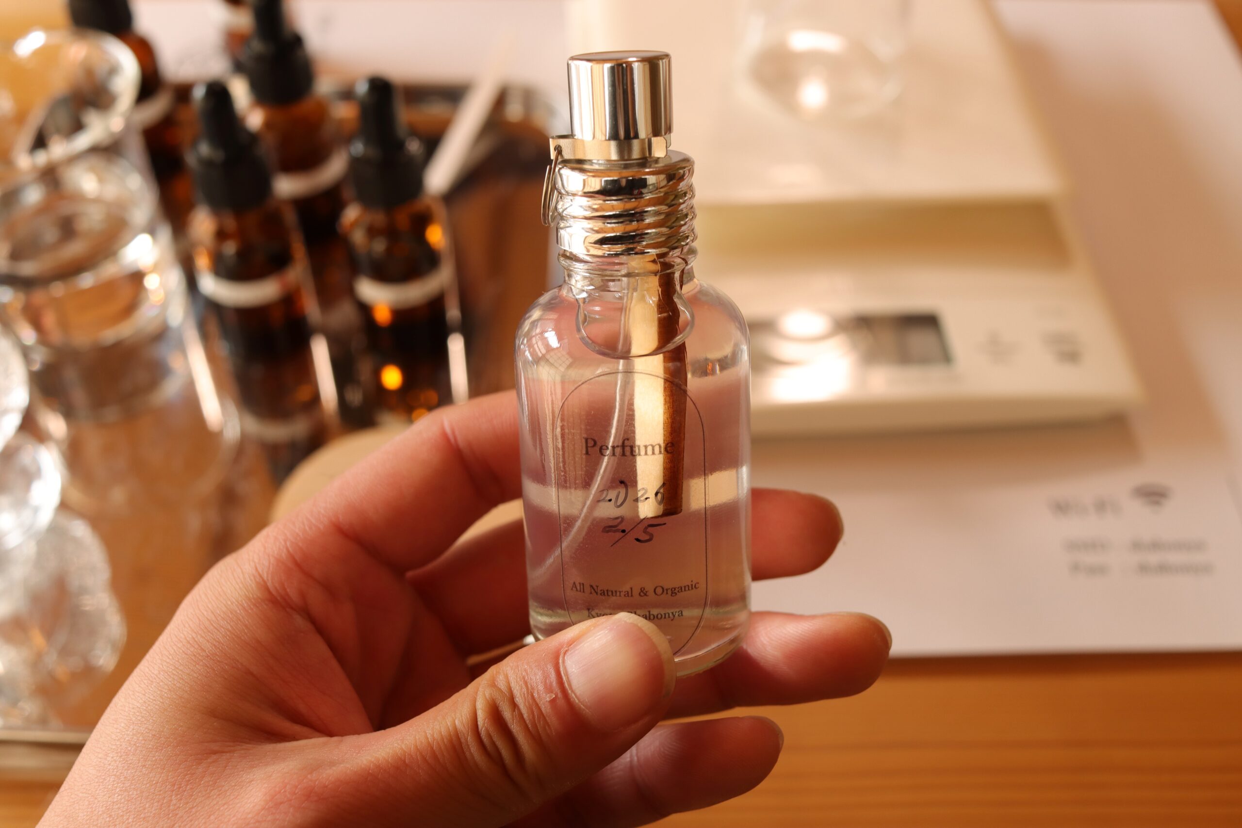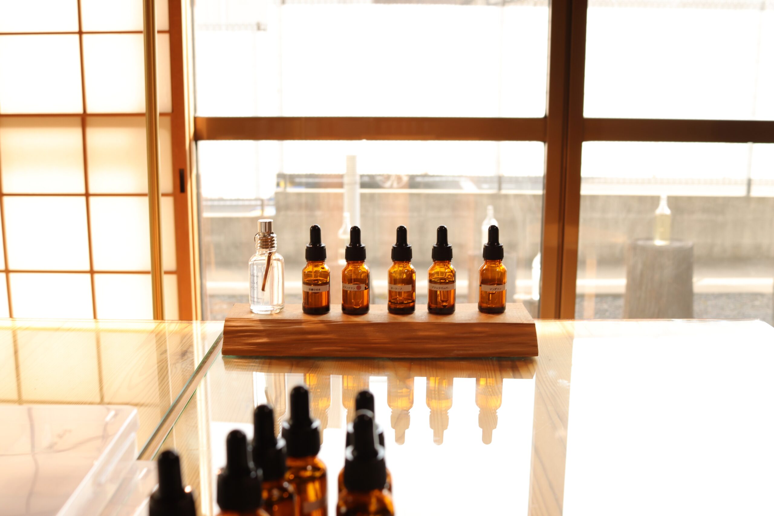 The table is made of wood, so you can create your own perfume, sitting on a chair while feeling the warmth of the wooden table, and without having to worry about your knees getting numb.