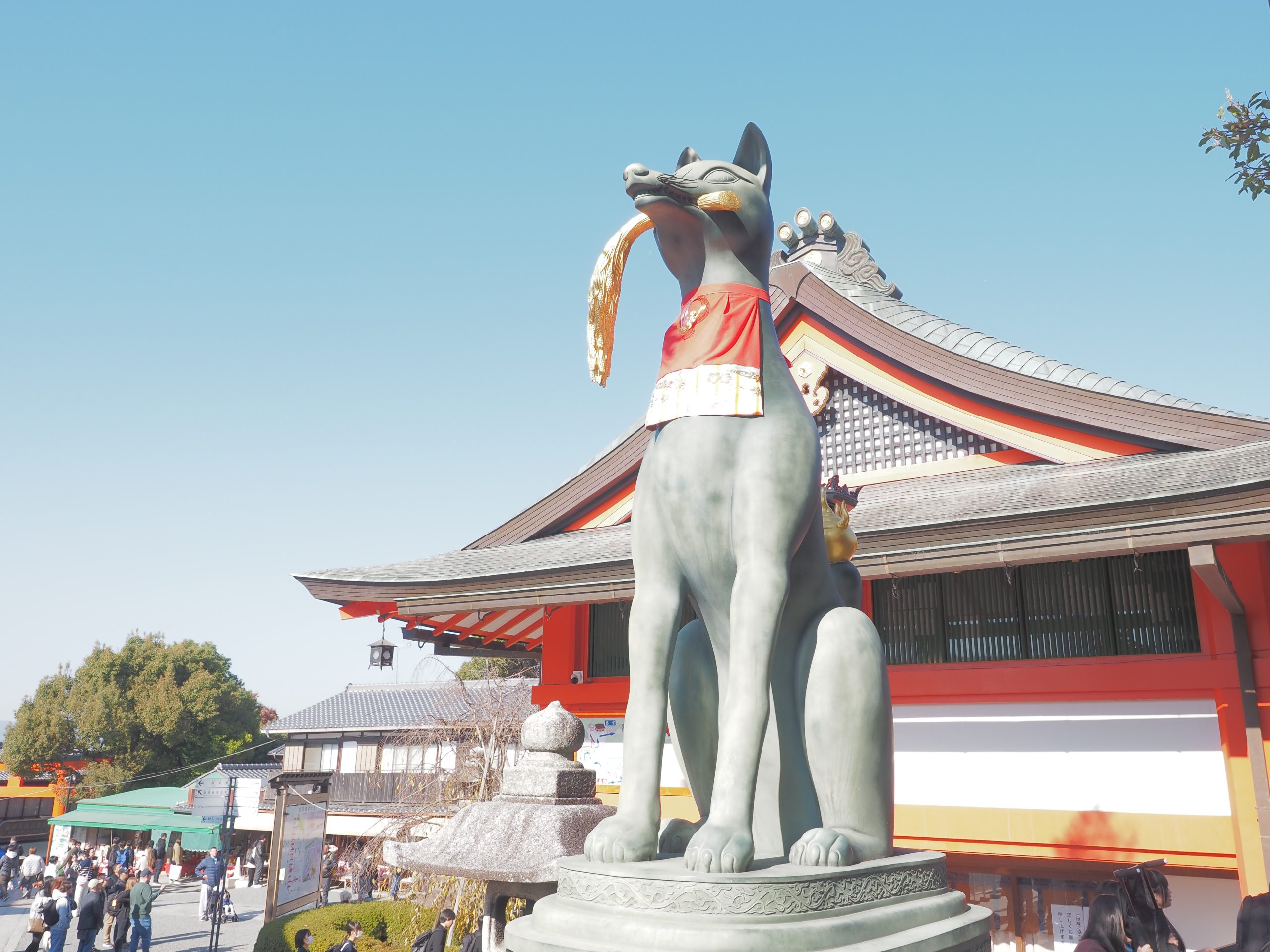 You may wonder why statues of a fox are placed in the precinct of Fushimi-inari Shrine. From the distant past when Japanese people adopted rice cultivation, the fox has been cherished as a sacred animal in contrast to Western countries where foxes are considered wily. This tendency has been attributed to the fox playing an important role in the paddy fields.