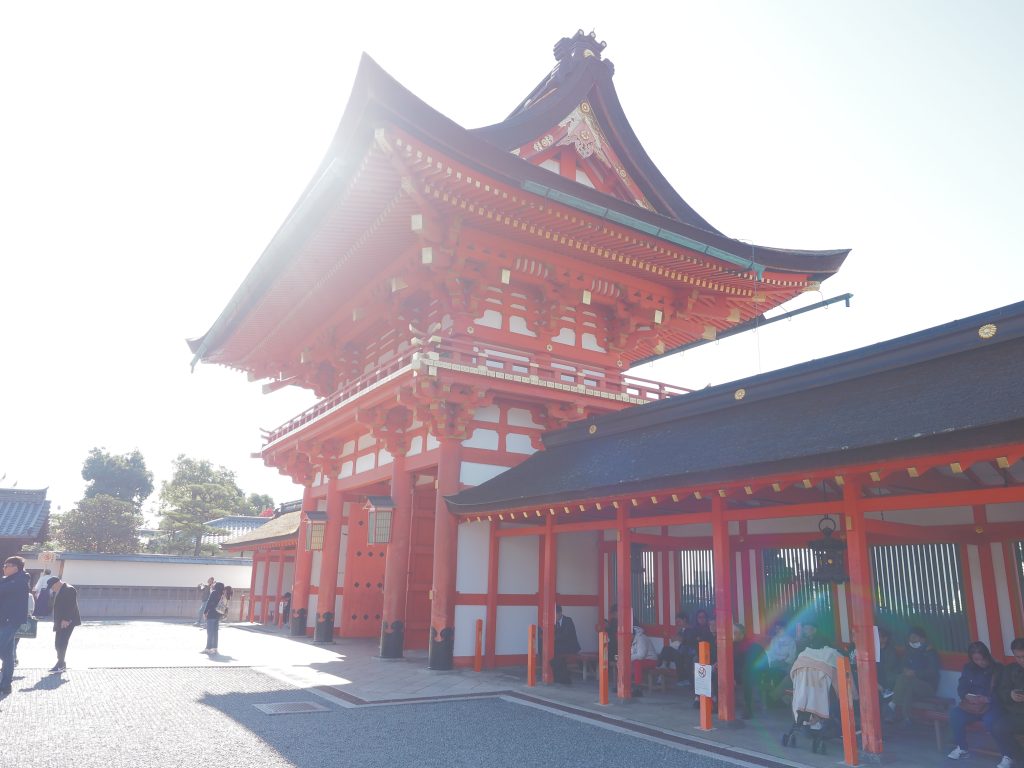 Fortunately, she recovered from her illness, and Hideyoshi was so delighted that he also put a lot of money into the reconstruction work of the Shinto buildings which had been severely damaged during the Onin war. The tower gate we see today was completed in 1589 to return the favor of the Inari gods.